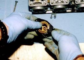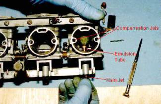 emulsion tube into the hole through the top of the carburetor. The main jet