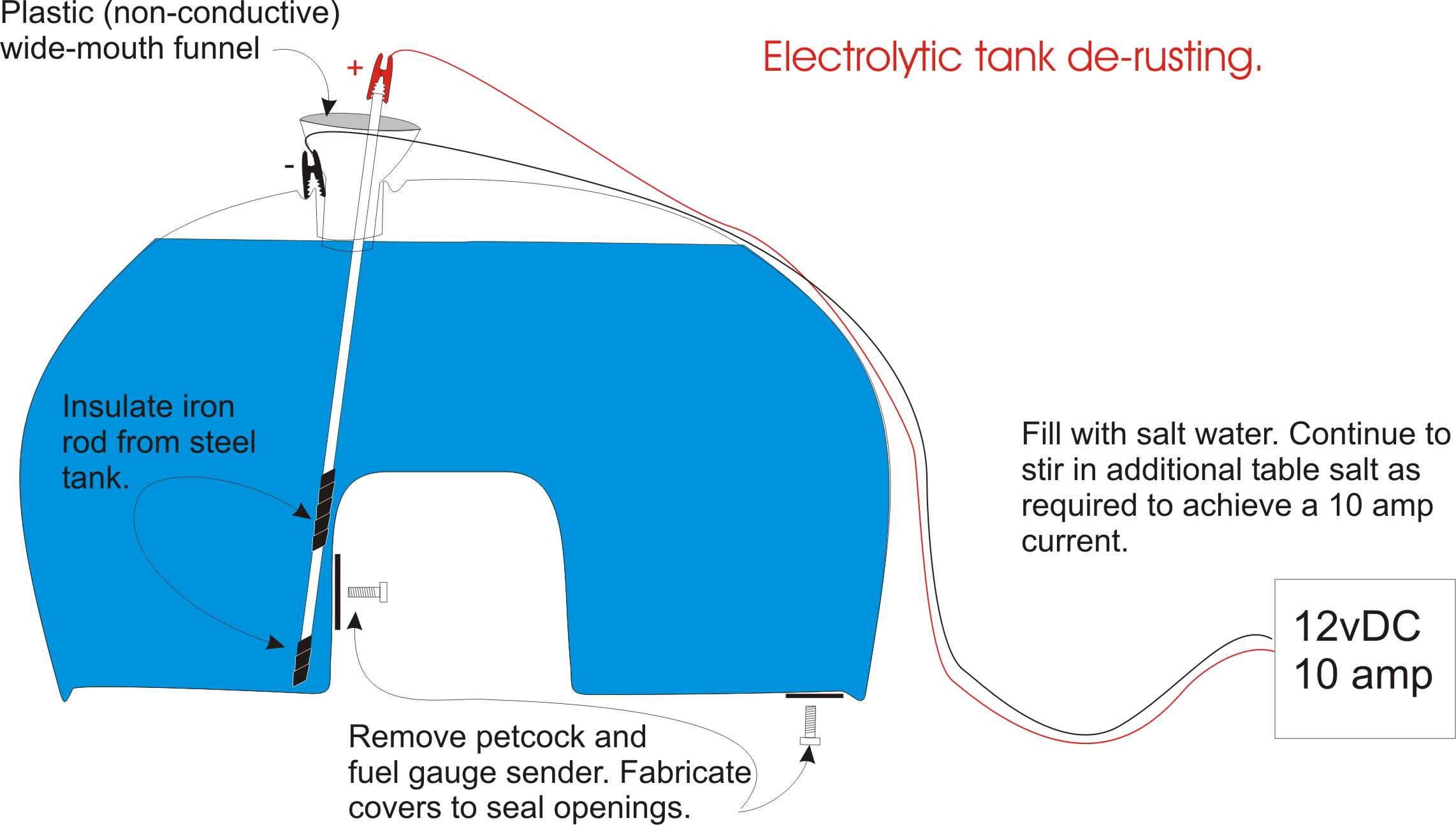 Pre-mix the saline electrolyte using 750 grams (1.5 lbs) of table salt to 5 gallons of water, and fill the tank. Tape up the end of a steel rod (I was told re-bar, but used all-thread ready rod which worked just fine) so it cannot short out against the tank bottom. Connect the negative lead of a 10 amp battery charger to bare metal on the tank (I used the gas cap mounting screw so as not to damage any paint). Place a wide-mouth plastic (non-conducting) funnel in the fill hole and put the rod in the tank through the funnel. Connect the positive lead to the electrode. It's best to use a charger with an ammeter. Mine just has a silly voltmeter gauge, so I connected the positive lead through a separate ammeter. Add salt as required to bring the current up to 10 amps. (The best I got was 9.4 amps, more salt didn't help after that). Check every 2 minutes, and stop when the rust is gone. (It got so murky, I couldn't see the hump after a while unless I sloshed out some of the water and tipped the tank. I don't know how they do this with a marine tank and still check it ;-)