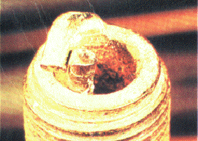 The plug below shows what can happen when something hits the spark plug. Something from inside the engine has hit the plug and this problem must be repaired before running the engine further. Make sure the spark plug is the correct length for the engine.