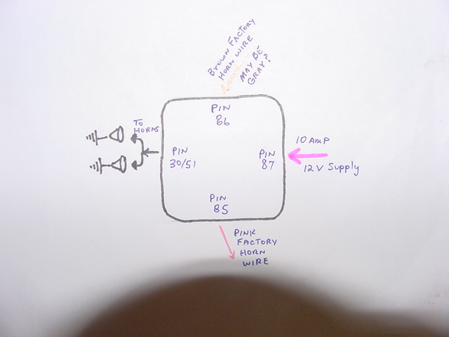12v of the factory horn wire (brown) to pin 86; the high amp