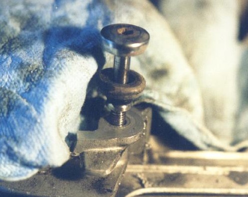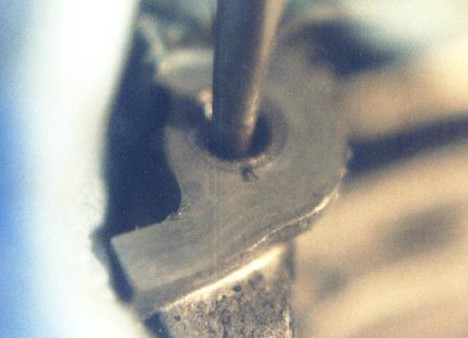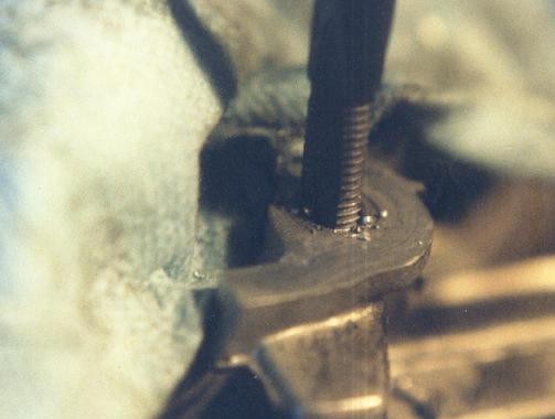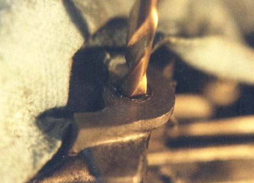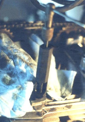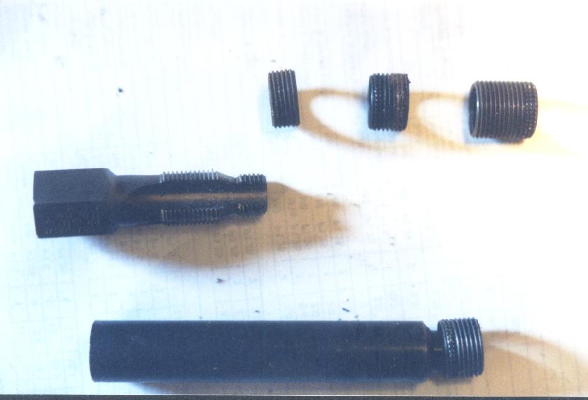 Next, the enlarged hole is tapped with the special Heli-coil tap. This tap comes in the kit and is the same thread pitch as the original 6mm, but the diameter is slightly increased to accomodate the enlarged hole.
