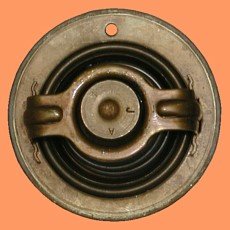 In plan view, I noted the size of the original thermostat aperture and also that the aperture was offset slightly from centre, toward the bottom of the pictures above. The aperture size, in part, would define how much coolant would pass through an open thermostat so finding a replacement with very nearly the same diameter of aperture was of paramount importance. I also noted the position of the vent hole relative to the aperture in the unlikely event that housing restrictions forced installation of a new thermostat with the vent in an unfavourable position, one that might trap air below the thermostat.